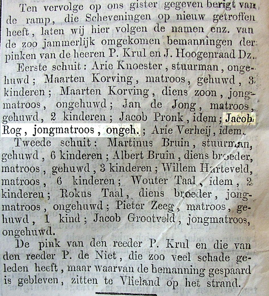 Rond 22 februari kwam er van Vlieland een telegram dat er twee Scheveningse pinken tijdens slecht weer met het aanlopen van de haven van Oost - Vlieland waren omgeslagen. De pink spoelde op het strand van Vlieland aan, maar lichamen werden er in het wrak niet meer aangetroffen.