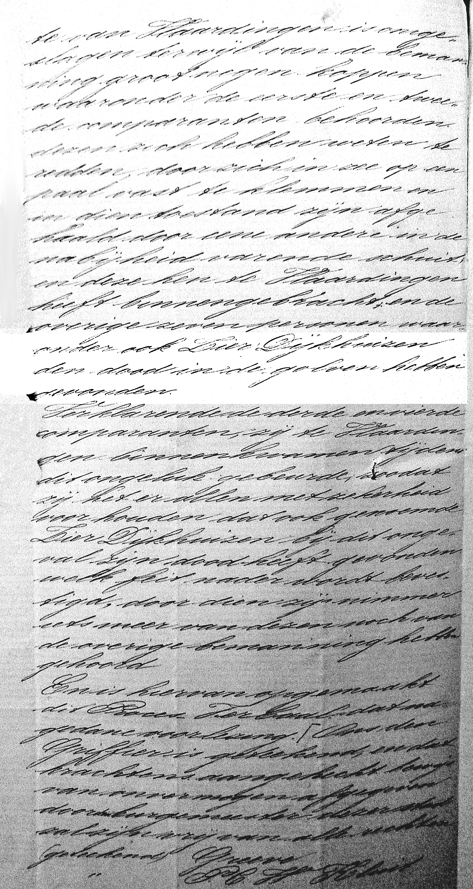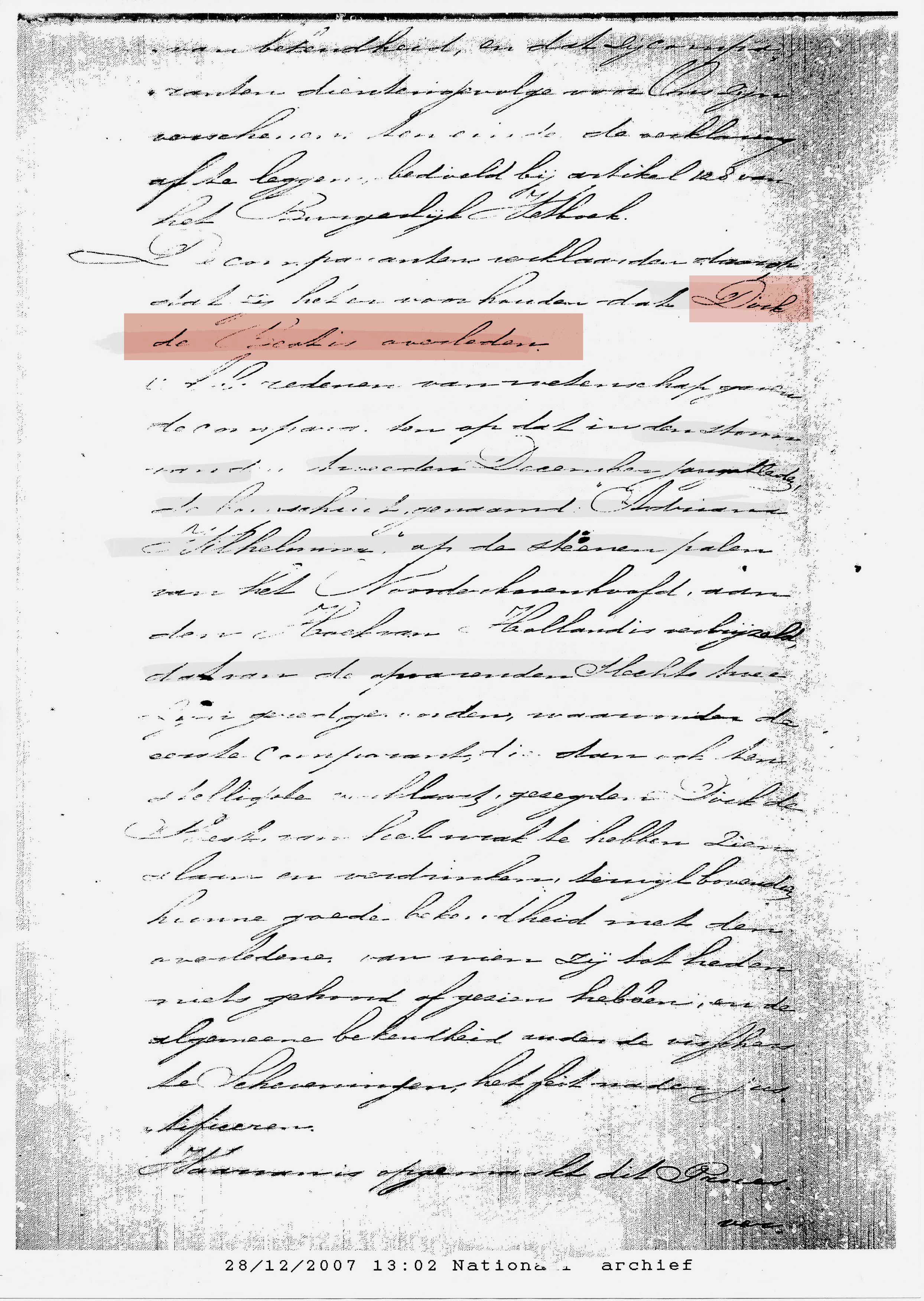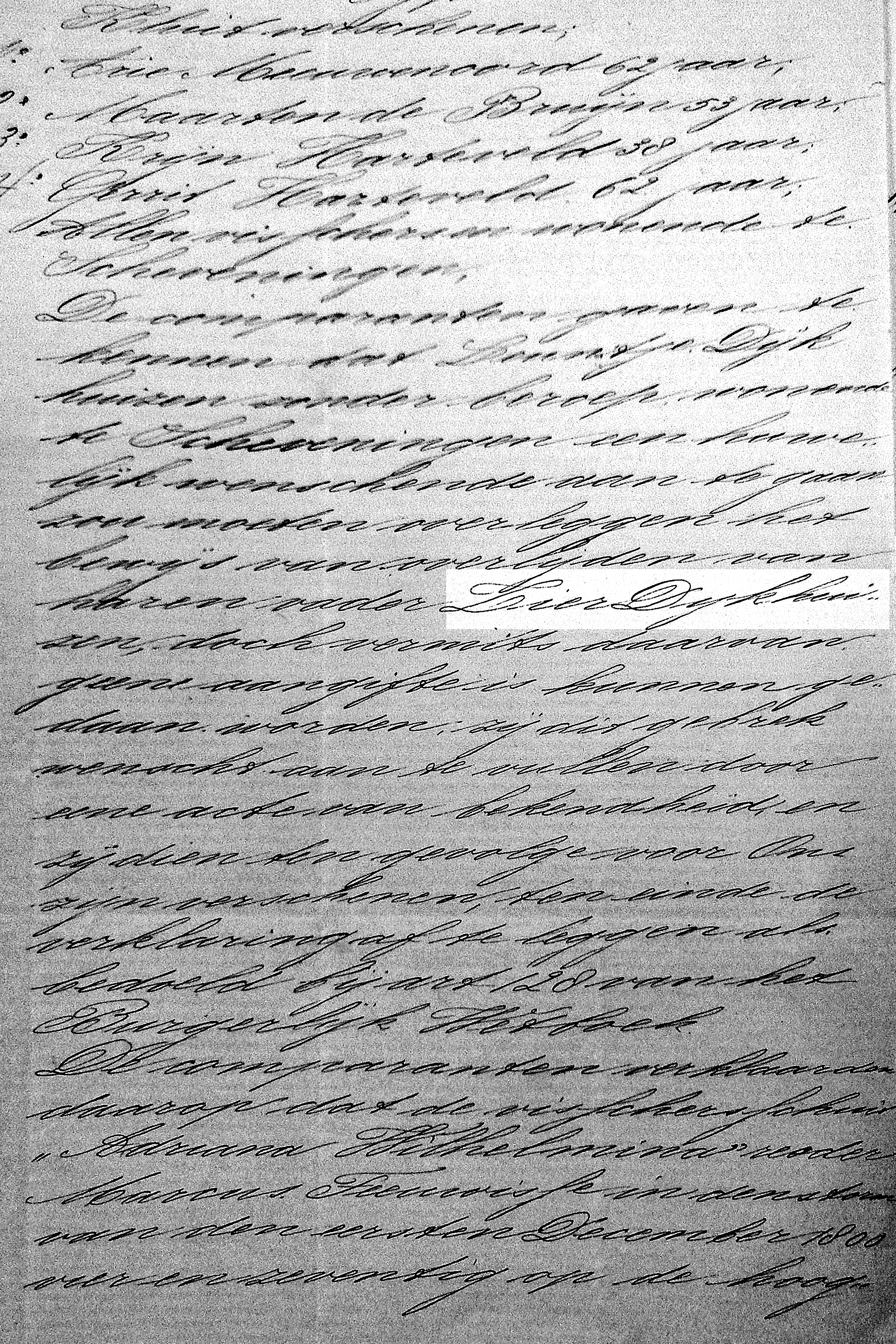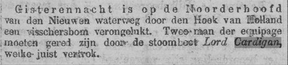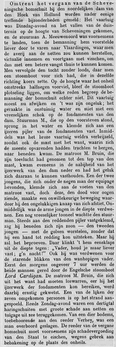 'We waren besloten bij het goede weder de nieuwe haven binnen te loopen, ten einde onze netten te repareren. Bij het binnengaan liep een stoomboot voor ons die wij volgden; eensklaps komt een andere boot de haven uit waarvoor wij moesten wijken. Bij het op zij gaan stootten wij op een onzigtbaren paal; het schip ging plotseling naar de grond. Wij trachtten ons aan den mast en andere inventaris te redden maar deze spoelden weg. Ik zwom en bereikte een grooten paal waartegen ik opklauterde, circa 5 minuten daarna zag ik een matroos aankomen die zich insgelijks aan den paal vastklemde, de anderen zijn allen verdronken, wij beiden hebben aan den paal gehangen van ’s avonds half 9 tot ’s morgens 7 ure. Toen zijn wij door de sloep ene stoomboot gered.'