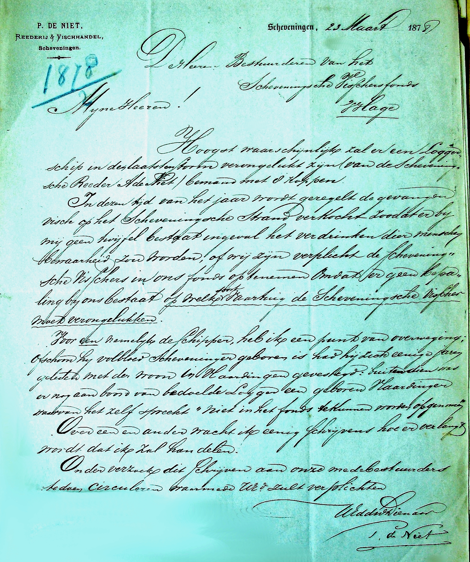 Rond de tweede week van maart bestond er ernstige ongerustheid over het lot van de houten zeillogger Scheveningen I. De logger had op 5 maart vanuit Nieuwendiep zee gekozen. Maar het had gestormd in die dagen en de logger was -met gebroken masten en gesleept door een Engelse vissloep- nog door Scheveningse vissers waargenomen. Bovendien koerste de sleep in de richting van de Hollandse kust aldus de teruggekeerde vissers. Latere berichten luidden echter dat de Engelsman de logger zou hebben losgelaten en de logger in afwachting van andere hulp voor anker was gegaan. Echter eind maart was er nog steeds geen bericht van de logger en bemanning zodat men moest aannemen dat de logger was verongelukt.