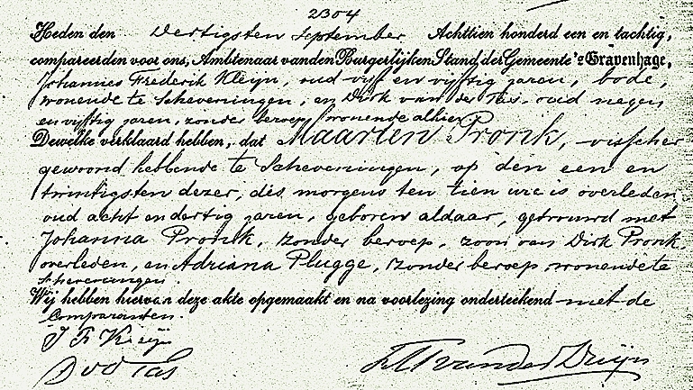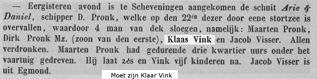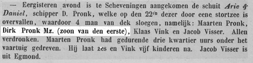 * Maarten Pronk: zijn lichaam werd gevonden en geconserveerd in zout naar Scheveningen gebracht. Zijn vader Dirk verdronk in 1860 op de ‘Vrouw Engeltje’.