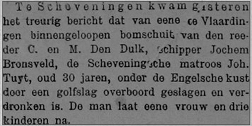 Rond 23 november kwam van de te Vlaardingen binnengelopen schuit het bericht dat op circa 60 mijlen verwijderd van de Nederlandse kust matroos Johannes Tuit overboord was geslagen en verdronken. Tuit liet een vrouw en drie kinderen na.