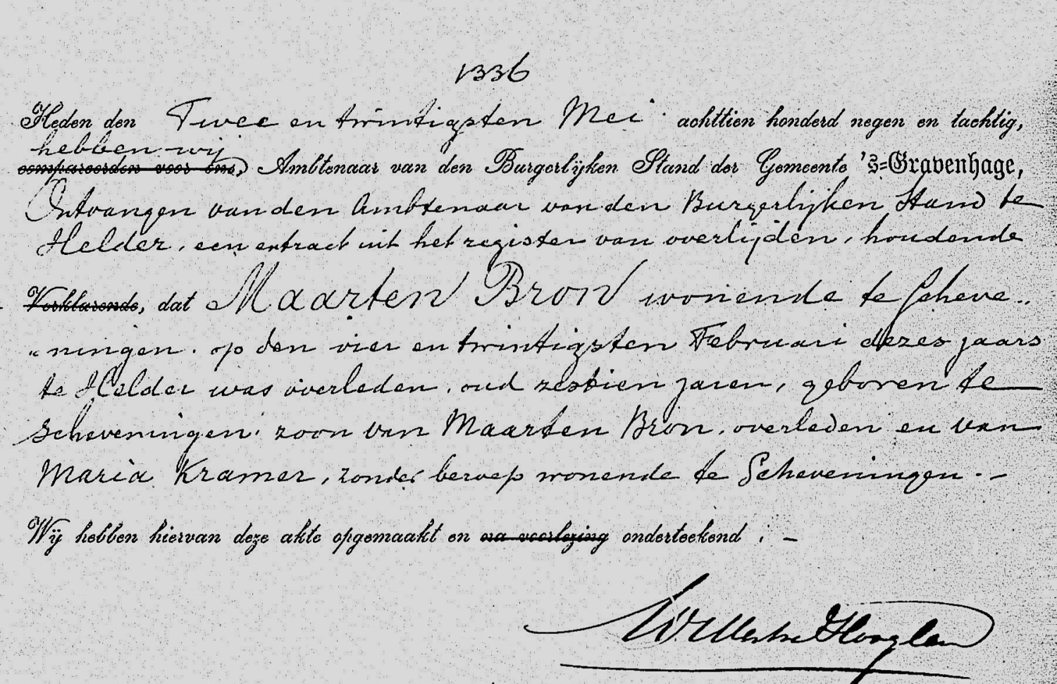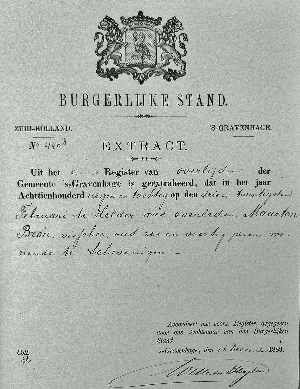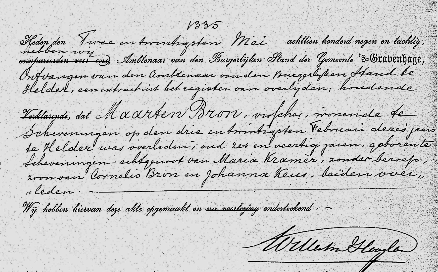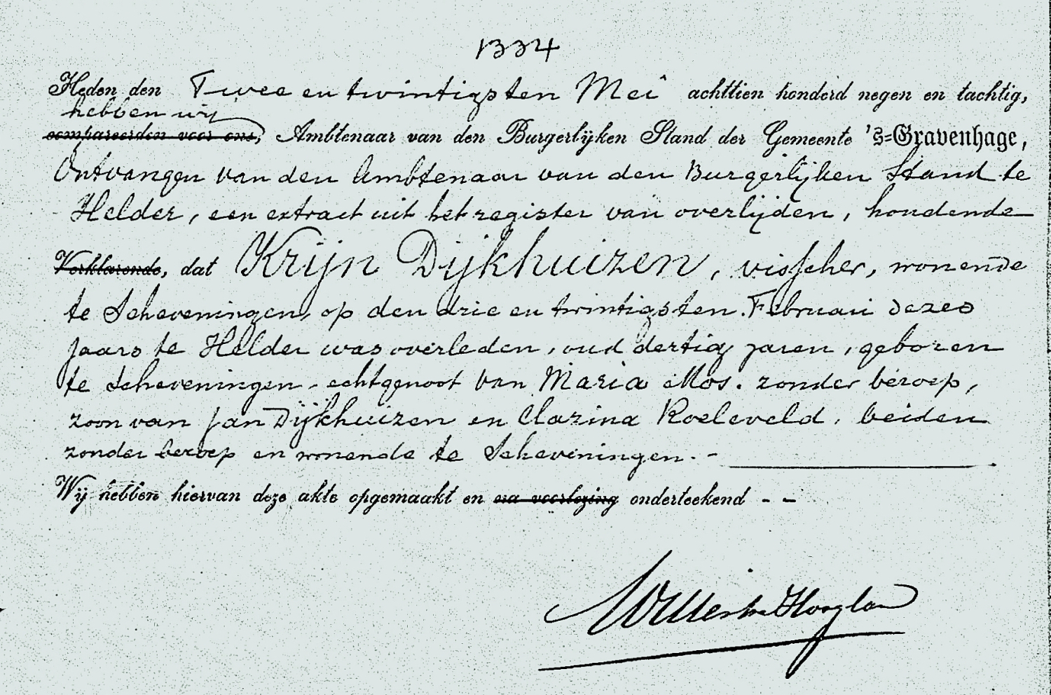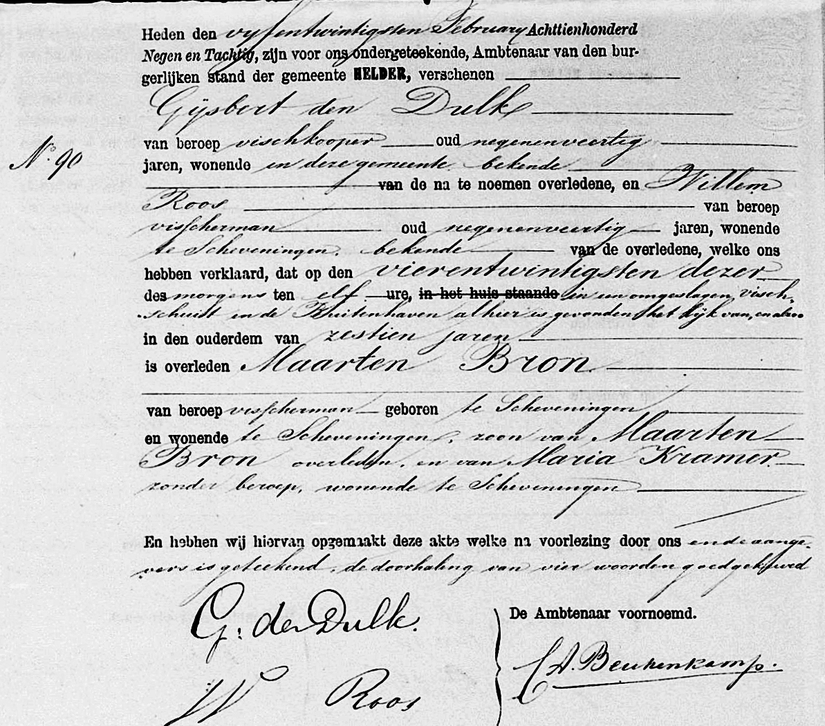 In diezelfde dagen kwam er de jobstijding. Tussen Scheveningen en Katwijk waren op het strand een halve mast, acht luiken en twee zwaarden aangespoeld. De zwaarden waren voorzien van de initialen K. D. H. De letters stonden voor Krijn Dijkhuizen, schipper van de bomschuit De Vier Gebroeders. Er was toen zekerheid dat de bomschuit tijdens de storm met zeven vissers was vergaan.