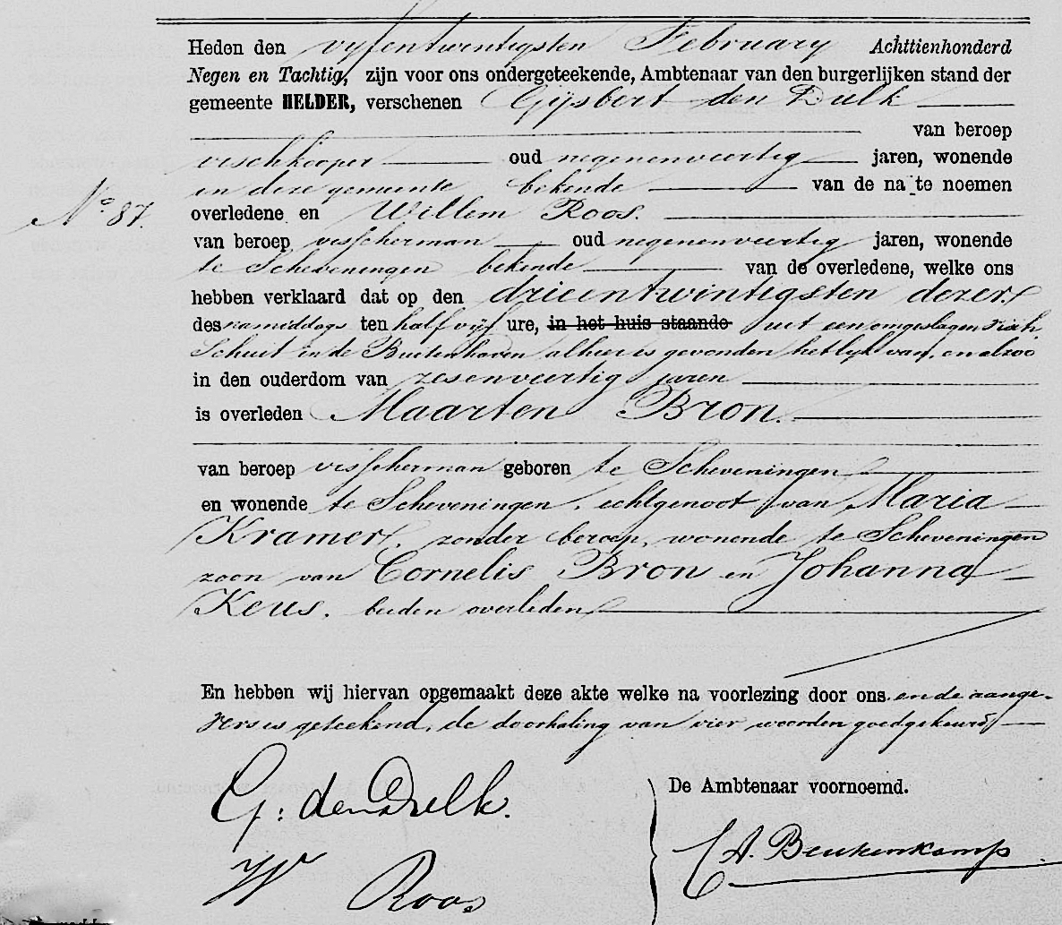 In Nieuwendiep zelf was intussen een aanvang gemaakt om de lichamen vanuit het gehavende schip te bergen. In de haven van de kleine kustplaats waren juist de bomschuiten SCH 208 en 155 binnengelopen. De schippers van die schuiten - Arie van der Zwan en Teunis Bruin - zagen het als hun plicht om de lichamen met eigen handen uit het gehavende schip te halen. In het schip trof men zes lijken aan waarvan één in een biddende houding en samengevouwen handen. Eén bemanningslid bleek dus vermist. De gevonden lichamen werden niet meer naar Scheveningen vervoerd. Kort na de 20e februari vertrokken tweeëntwintig nazaten van de slachtoffers van Scheveningen naar Nieuwendiep waar op de Algemene Begraafplaats van Huisduinen de lichamen zouden worden begraven. Kosteloos vervoerd door de Hollandsche IJzeren Spoorweg-Maatschappij en vergezeld door de godsdienstleraar C. M. Dekker arriveerde het rouwende gezelschap bij het plaatselijke lijkenhuis waar enkele toespraken en gebeden werden gehouden. Vervolgens werden de zes lijkkisten in drie lijkwagens geplaatst. In de eerste de stoffelijke resten van vader en zoon Bron. In de tweede de broers Krijn- en Wouter Dijkhuizen en in de derde wagen hun oom Arie Pieter Dijkhuizen en de 23-jarige Arie Roos. Een veertiental koetsen met nabestaanden en anderen volgden de droevige lijkstoet. Op de begraafplaats aangekomen werden door Nieuwedieper- en Urker vissers de volwassen overledenen naar de groeve gedragen en de laatste eer toegebracht. De kist van de 16-jarige Maarten Bron werd door vissersjongens van die leeftijd naar de groeve gedragen. Ieder van hun droeg een wit roosje die zij vervolgens op de kist legden. Bij het graf staande werden de nabestaanden toegesproken waarbij een bijzonder woord tot de 59-jarige Jan Dijkhuizen werd gericht die niet alleen zijn broer maar ook zijn twee zoons had verloren.