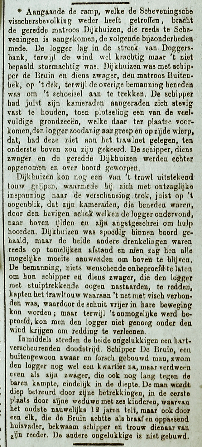 De zeillogger lag ter hoogte van de Doggersbank aan het trawlnet toen op het punt van inhalen van het net slechts schipper Jan Bruin, matroos Joris Buitenhek en matroos Dijkhuizen zich al aan dek bevonden. Het stormde niet maar er stond een krachtige wind met een lastige zee. De rest van de bemanning bevond zich nog benedendeks om hun schoeisels e.d. aan te trekken. Nog maar net had schipper Bruin de twee matrozen aangeraden zich goed vast te houden toen een hevige grondzee de logger op z’n kant gooide. Doordat de logger nog aan het trawlnet lag ging het niet geheel plat. Echter schipper Bruin, de matrozen Buitenhek en Dijkhuizen waren daarbij als het ware opgenomen en overboord gesmeten. Dijkhuizen kon nog de lijn van de uitstaande trawl grijpen en zich met veel krachtinspanning naar de verschansing toe trekken. Intussen was de overige bemanning bovendeks gekomen en konden de om hulp schreeuwende Dijkhuizen binnenboord trekken. De beide andere waren echter te ver van het schip verdaagd waarbij men moest toezien dat zij alle moeite hadden om zich boven water te houden. De bemanning kapte daarop haastig het trawlnet waardoor de logger vrijer in haar beweging kon worden. Echter wat men ook deed, men kon de logger maar niet voldoende onder wind krijgen waardoor een draai gemaakt kon worden om de twee om hulp roepende collega’s te redden. Kennelijk waren de twee de zwemkunst meester want zij zwommen nog wel een kwartier met hun laatste krachten achter de logger aan. Uiteindelijk begaven hun krachten het zodat de Johannes Bruin en zijn zwager Joris Buitenhek in de diepte wegzonken. Johannes Bruin liet een weduwe met 5 kinderen na. Zijn zwager Buitenhek had geen kinderen.