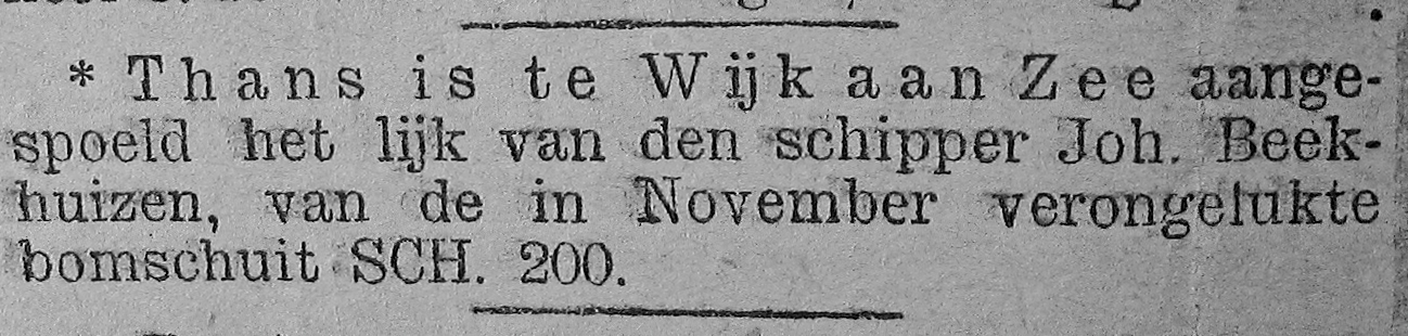 Groot was echter de verbazing toen op 2 december de bomschuit SCH 34 ‘Holland II’ van reder J. Jenezon de haven Maassluis binnenliep met aan boord één van de verdronken gewaande matrozen. De schipper Cornelis den Dulk Cz. die eveneens op de noodseinen was afgekomen vond de Noordwijker matroos Matthijs van der Linden nog zwemmend in het woelige water en kon hem heelhuids aan boord nemen. Een volgende verbazing was dat de ‘Vrouw Adriana’ met haar ingedeukte boeg maar niet meer als een wrak, maar nog half drijvend, op het strand bij Noordwijk aandreef. Even opmerkelijk is het feit dat het lichaam van schipper Johannes Beekhuizen op 2 maart van het daaropvolgende jaar op het strand van Wijk aan Zee aanspoelde.
