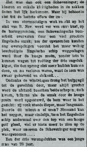 Circa vier uren varen vanuit de Scheveningse kust hadden zware stortzeeën de boeg van de aan de vleet liggende bomschuit zodanig beschadigd dat het schip water maakte. Na het geven van noodseinen kwam een Engelse stoomtrawler opdagen om hulp te bieden. Andere gegevens luidden echter dat bom door de trawler zelf zou zijn aangevaren. Met een eerste reddingspoging konden slechts de vissers Giel Keus, Dirk Bal, Hendrik Westerduin en Leen Jongejan aan boord van de trawler worden genomen. Een tweede reddingspoging, waarbij de vleet moest worden gekapt, zodat de stoomtrawler de bomschuit beter kon naderen mislukte jammerlijk. De overige vijf vissers werden vervolgens door aanhoudende stortzeeën van boord geslagen. Andere aanwijzingen duiden er op dat zij met hun reddingsloep waren omgeslagen en verdronken. Hoe dan ook, de vier geredde vissers en hun Engelse redders moesten toezien dat de overige niet meer konden worden gered. De stoomtrawler zette vervolgens koers naar de Engelse wal. Vanuit het Britse Lowestoft werd reder Mos op de hoogte gesteld van de ramp met het verlies van vijf vissers en zijn schuit. Althans zoals tot dusver werd gedacht.