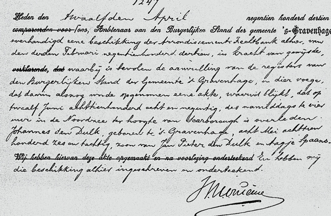 Ter hoogte van Scarborough verdronk de nog jonge Johannes den Dulk. Meer is er van het voorval niet bekend geraakt.
