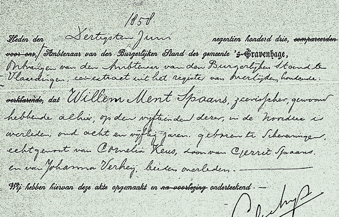 Aan boord van de bomschuit kreeg Willem Ment Spaans een beroerte waaraan hij overleed. Zijn zoon Gerrit was schipper op de schuit. Spaans werd te Vlaardingen aan wal gebracht.