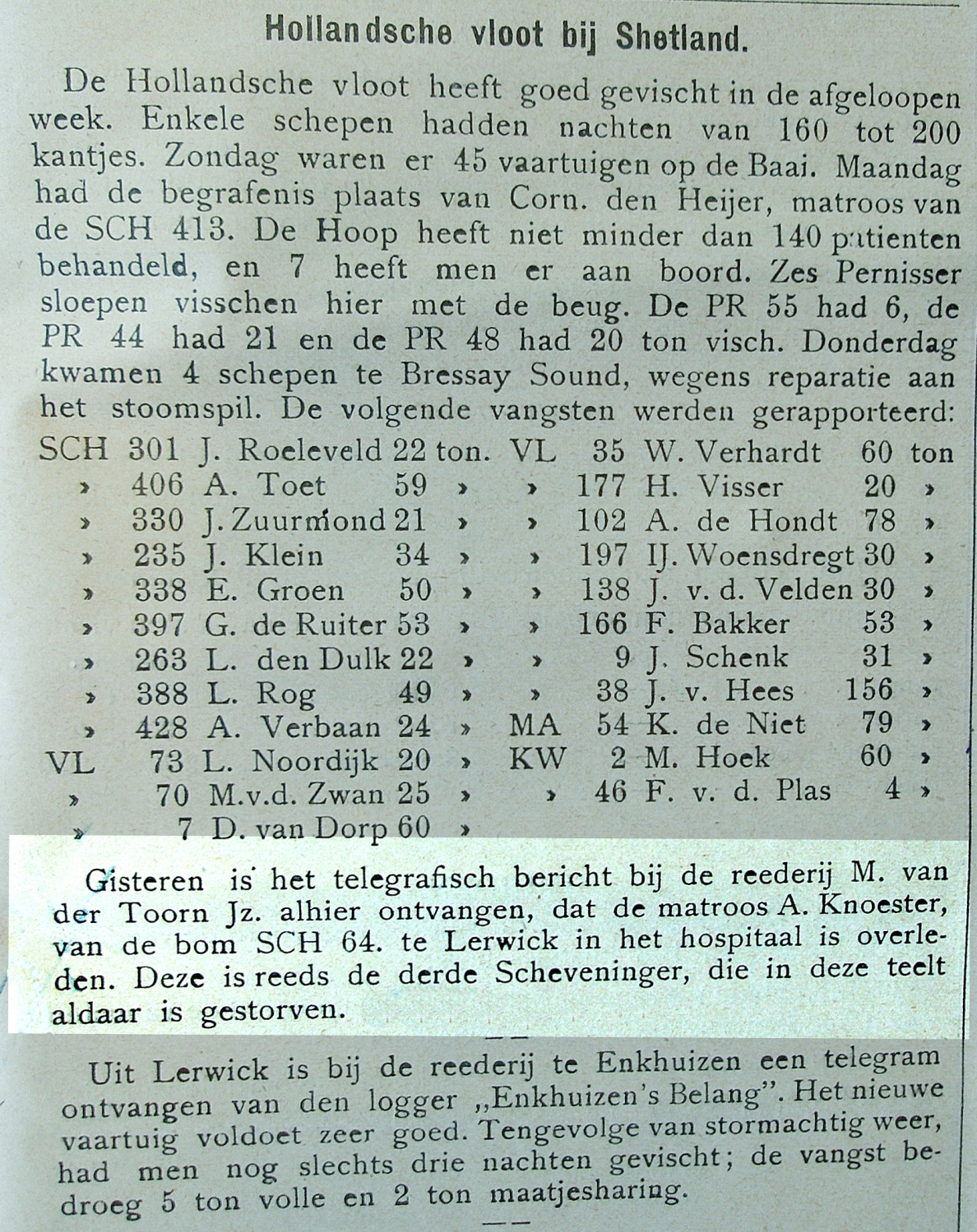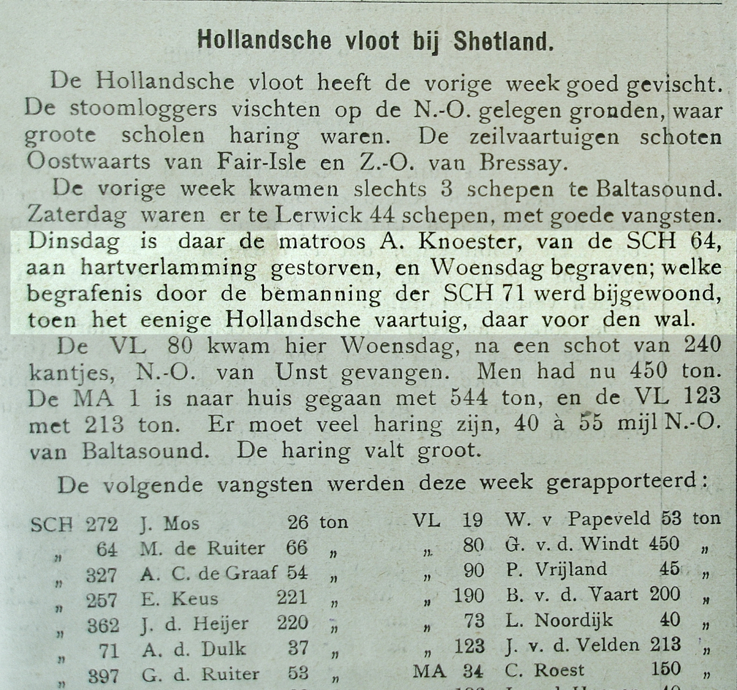 Aan boord van de bomschuit werd Arie Knoester door een acute hartaanval getroffen waaraan hij overleed. Het lichaam werd te Lerwick aan wal gebracht en de volgende dag begraven. De begrafenis werd bijgewoond door de bemanning van de bomschuit SCH 71 ‘Maria’ van schipper Arie den Dulk.