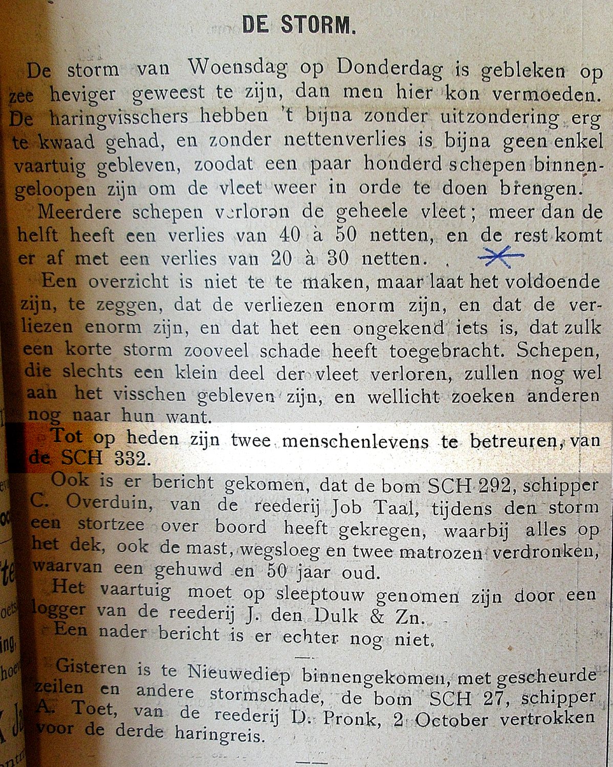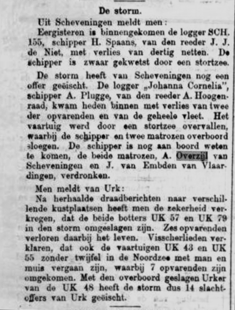 Een stortzee op de haringgronden van de Doggersbank vaagde alles wat zich aan dek van logger bevond de zee in. Behalve dat het schip ook van zijn vleet ’werd afgegooid’ raakten daarbij ook drie vissers overboord waaronder schipper Plugge. De schipper kon, na eerst tien minuten in het water te hebben gelegen, als door een wonder nog worden gered. Echter voor de Vlaardinger J. van Embden en Albert Grootveld z.n. Overzeil uit Scheveningen kon niets meer worden gedaan.