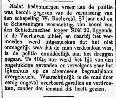 In de haven van Schiedam viel Willem Leenderd Roeleveld bij het aan boord gaan van zijn schip van de loopplank en verdronk daarbij. Roeleveld liet een vrouw en drie kinderen na.