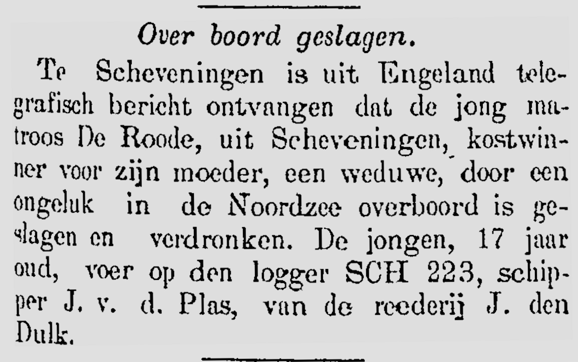 Rond 16 september kreeg reder Den Dulk vanuit Engeland een telegram. Schipper Van der Plas meldde daarin zijn reder dat matroos Dirk de Roode overboord was gevallen en verdronken. Aanvullende informatie gaf aan dat De Roode door eigen onvoorzichtigheid zoals tijdens spelen en stoeien overboord was geraakt. Voorts keerde de schipper, na het verzenden van het bericht, niet direct huiswaarts zodat de zeillogger pas weer op 12 oktober van zijn haringreis in de Scheveningen terugkeerde.