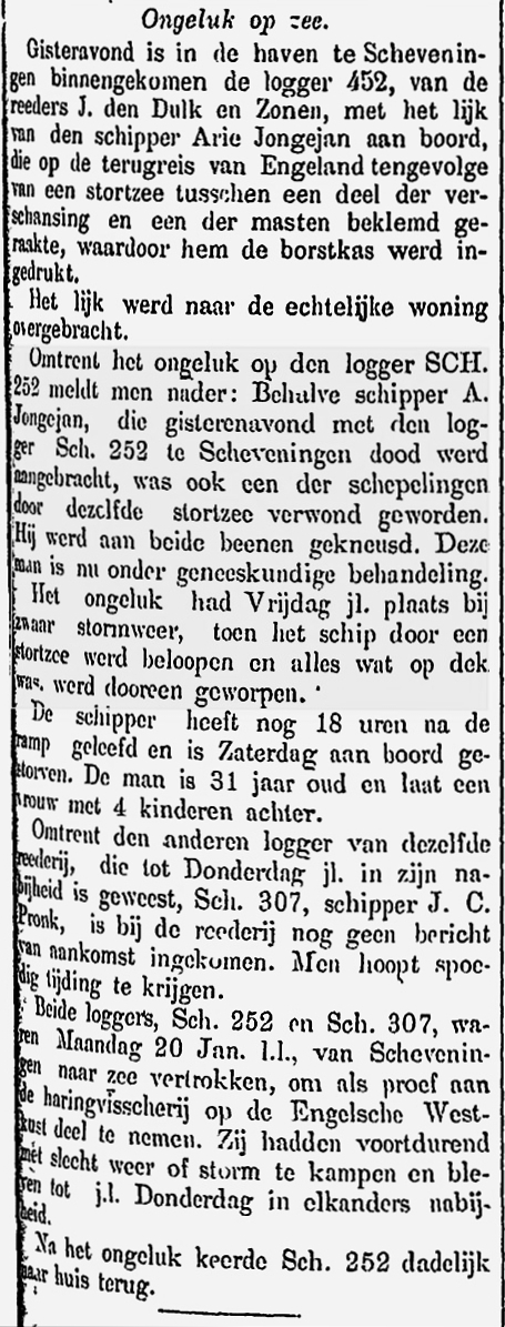 Op 20 januari 1908 zond reder Den Dulk twee van zijn schepen voor de winterharingvisserij naar de noordwestkust van Schotland. Deze vroege vorm van experimentele visserij had tot doel de vissers in hun beroep bezig te houden en een gunstiger resultaat te verkrijgen dan de trawlvisserij op rond- of platvis gedurende de wintermaanden bood. Het was aanvankelijk de bedoeling om het Schotse Stornoway - gelegen op het Hebriden-eiland Lewis- te bereiken om vanuit die vissersplaats, te haringvisserij uit te oefenen. De twee houten zeilloggers de SCH 252 ‘Zeeburg’en de SCH 307 ‘De Hoop’ kregen echter al tijdens de uitreis met veel stormweer te kampen. Hoewel het Caladonian Canal, een verbinding tussen het noordelijk gedeelte van de Noordzee en de westkust van Schotland, al tientallen jaren gereed was kozen de schippers Jongejan en Pronk vermoedelijk voor de meer noordelijke maar verraderlijke doorvaart van de Pentland Firth. Vast staat dat de ‘Zeeburg’ de wateren rond Stornoway niet bereikte en aan vissen is toegekomen. Stortzeeën bestookten de logger waarbij schipper Arie Jongejan tussen een stuk weggeslagen verschansing en de mast bekneld raakte waarbij zijn borstkas werd ingedrukt en enkele uren daarna overleed. Met veel averij aan de logger koos de bemanning voor de terugreis waarna het in de eerste week van februari, met aan boord het lichaam van hun schipper, Vlaardingen binnenliep van waaruit men reder Den Dulk op de hoogte stelde. Op 5 februari kon bij de burgerlijke stand het overlijden van Arie Jongejan worden aangegeven.
