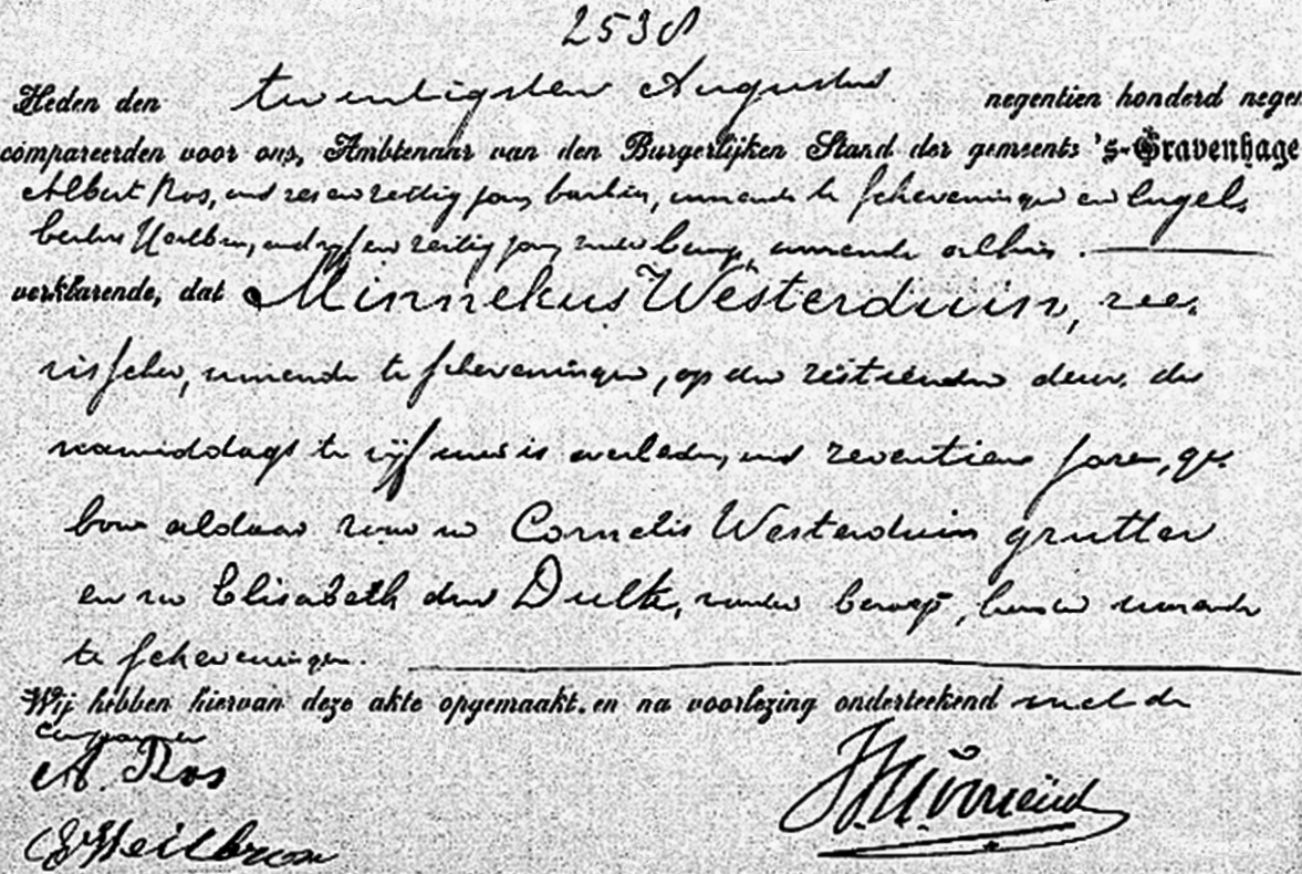 Op 20 augustus liep de zeillogger Schiedam binnen. De schipper had de reis moeten onderbreken om het dode lichaam van Minnekus Westerduin aan wal te brengen. De matroos was tijdens het spelen met andere jongens in de mast geklommen. Hij greep daarbij echter mis en stortte naar beneden. De jongen raakte zo zwaar gewond dat hij de volgende dag overleed. Het lichaam werd met een binnenschuit vanuit Schiedam naar Scheveningen vervoerd.