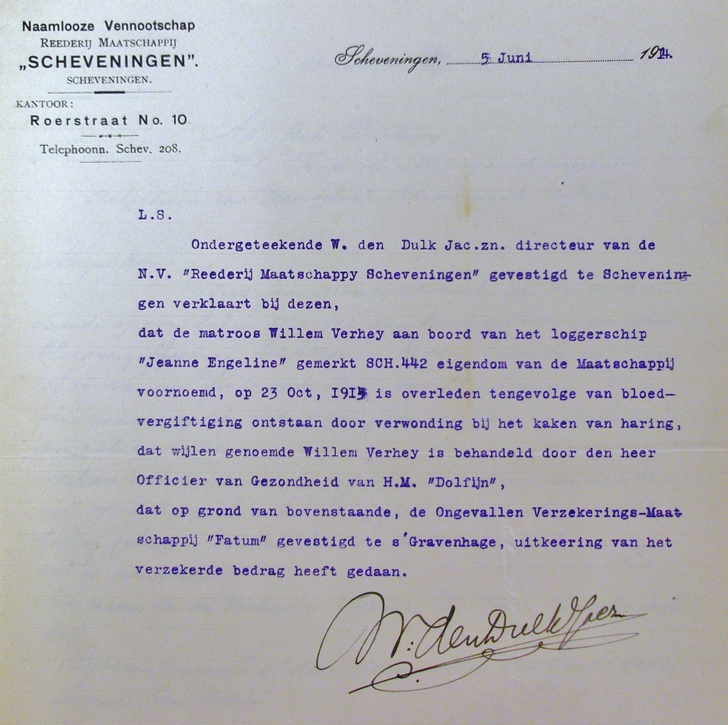 De aan boord overleden Willem Verheij had zich met het haringkaken in de vinger gesneden. Hij kreeg daarna bloedvergiftiging waarvoor hij door de arts van de H.M. ‘Dolfijn’nog werd behandeld. Verheij overleed echter toch. Het lichaam werd aan wal gebracht.