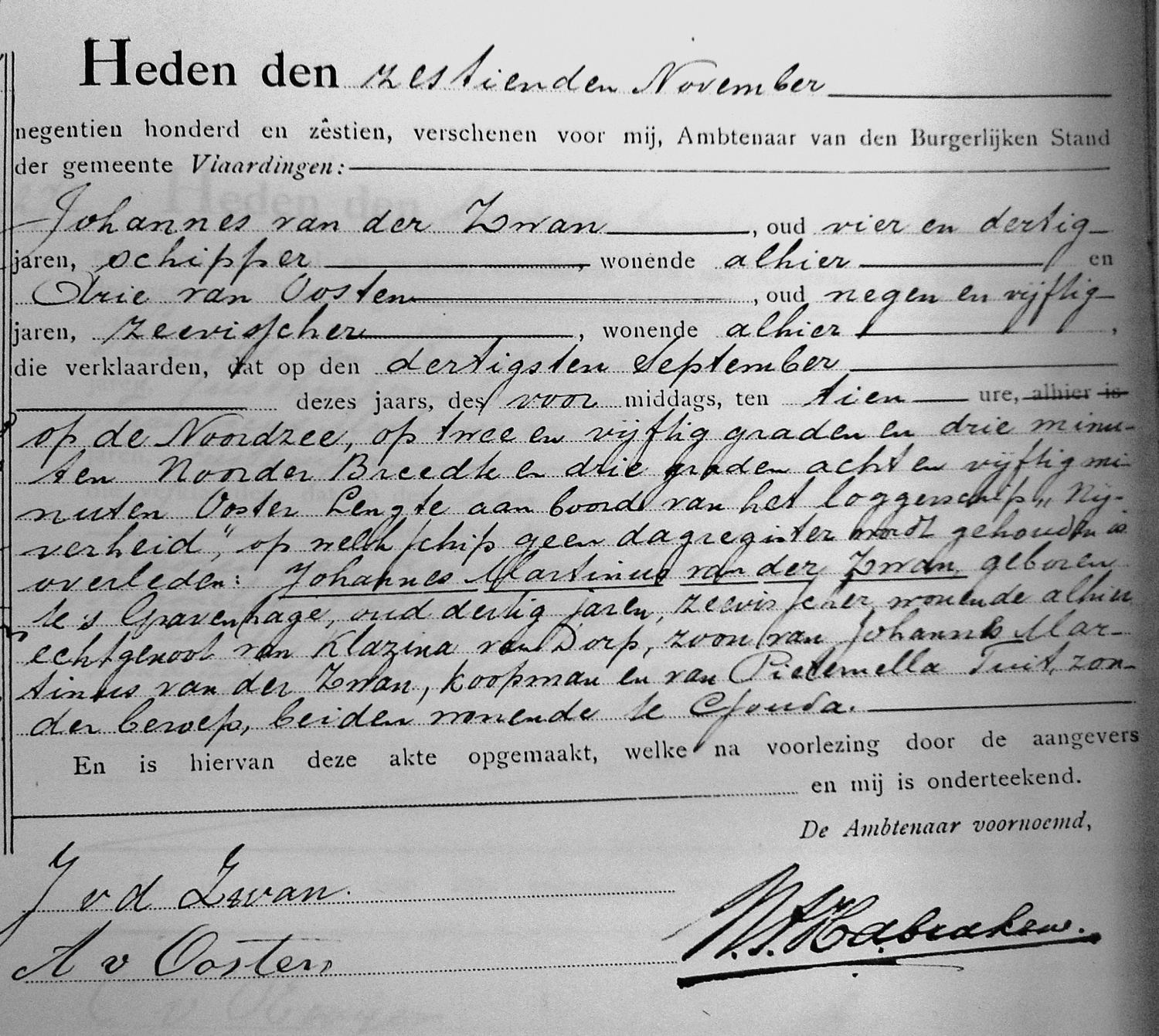 Op zee overleed de 30-jarige Johannes Martinus van der Zwan. Van der Zwan was in 1886 op Scheveningen geboren maar vertrok in 1896 met zijn ouders naar Vlaardingen.