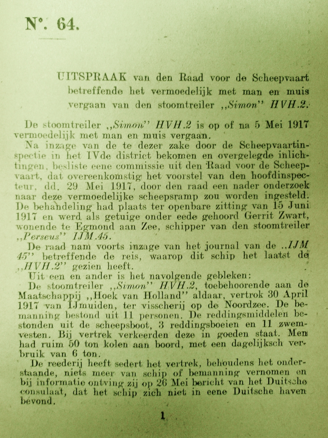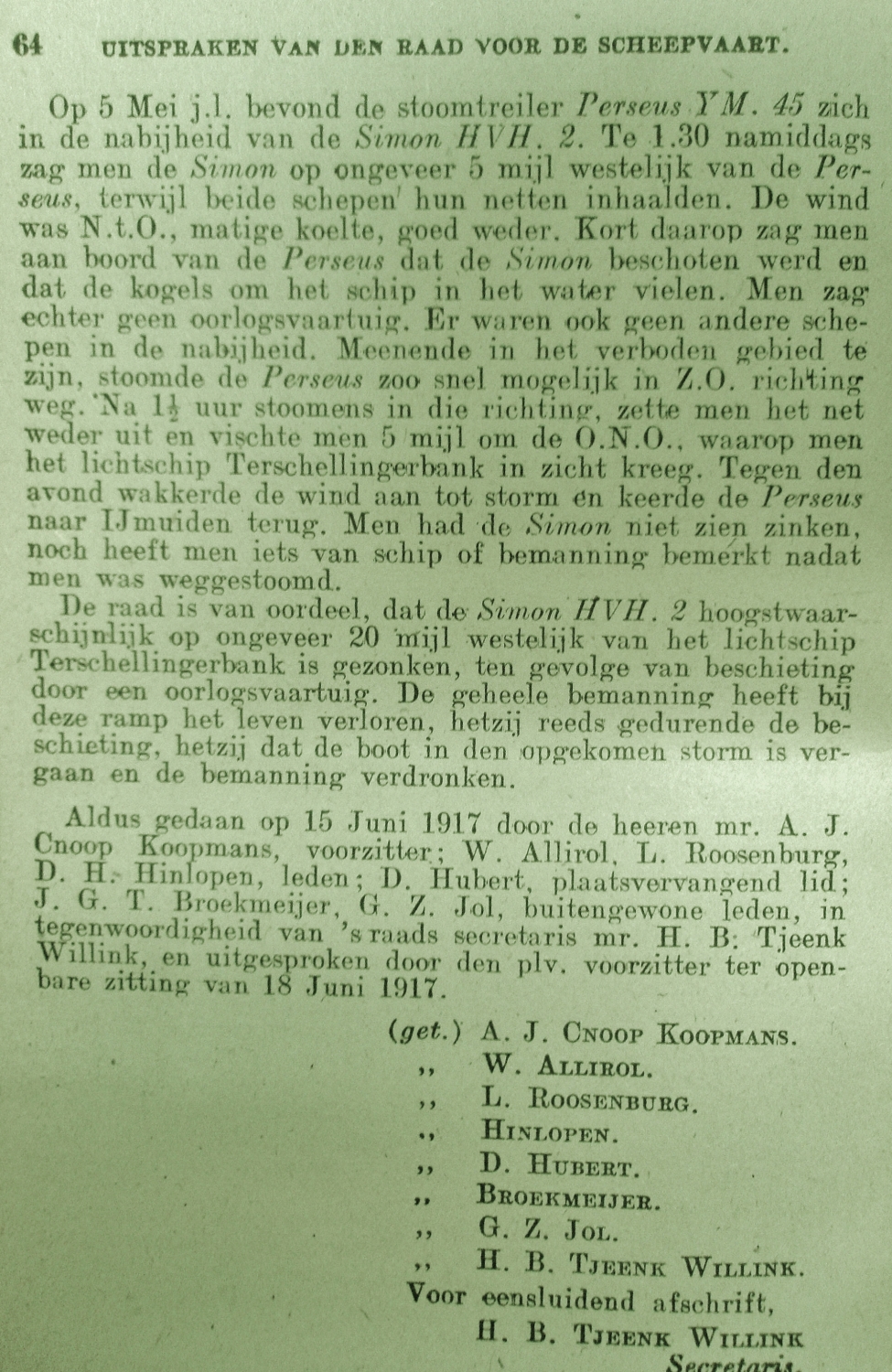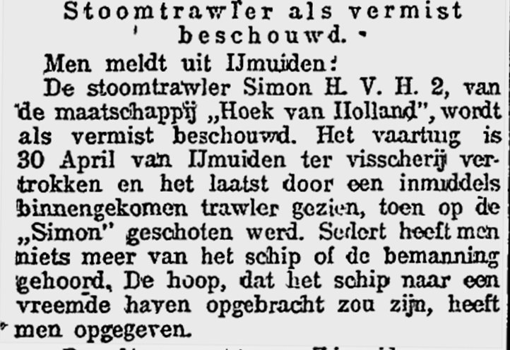 * Een in de jaren-90 verricht onderzoek in het Duitse U-Boot-Archiv liet zien dat de HVH 2 'Simon' door de U-Boot S.M. UC-71 op 5 mei 1917 met geschutsvuur tot zinken is gebracht. Hierbij is de gehele bemanning omgekomen. In 1919 zonk de U-Boot nabij Helgoland.