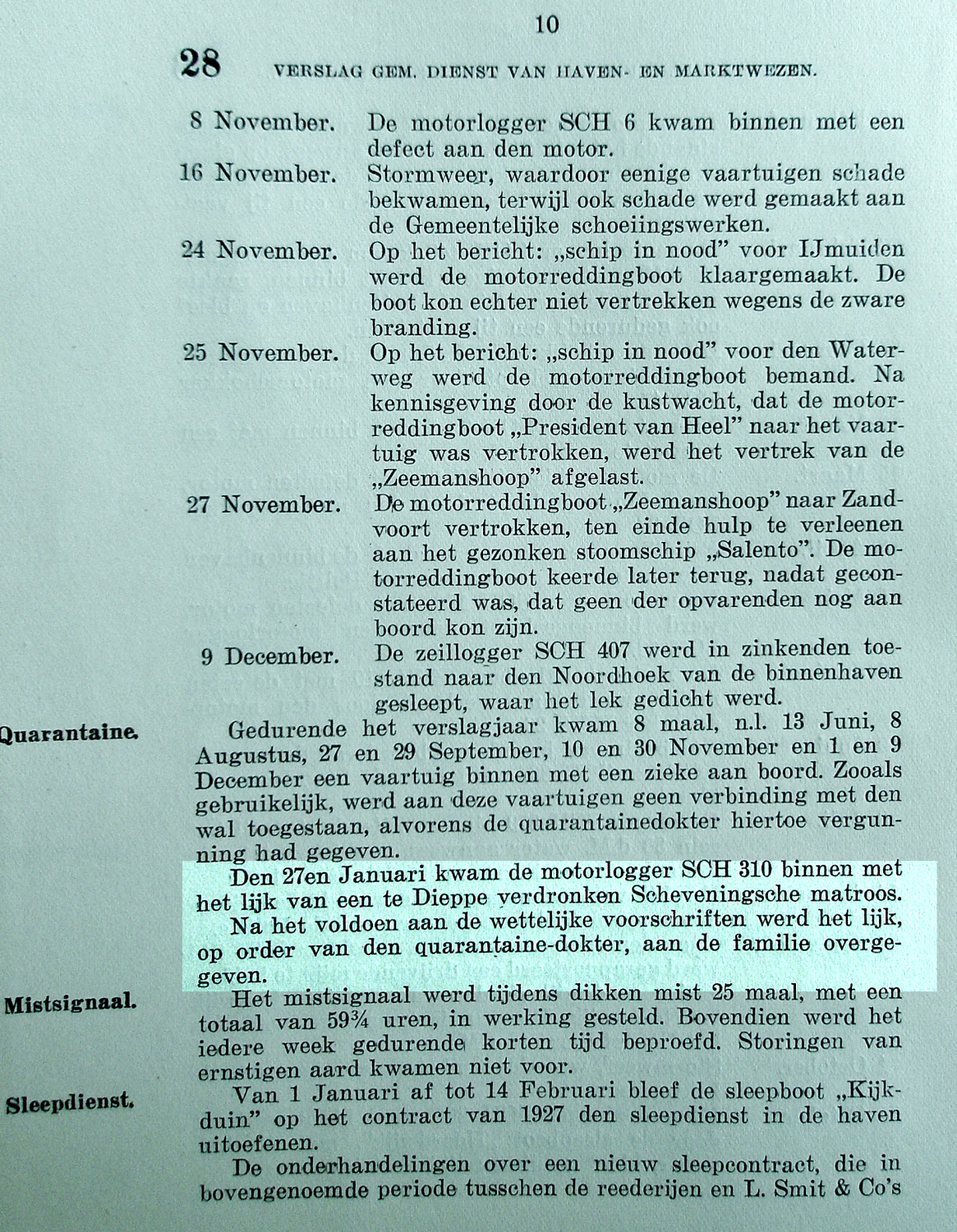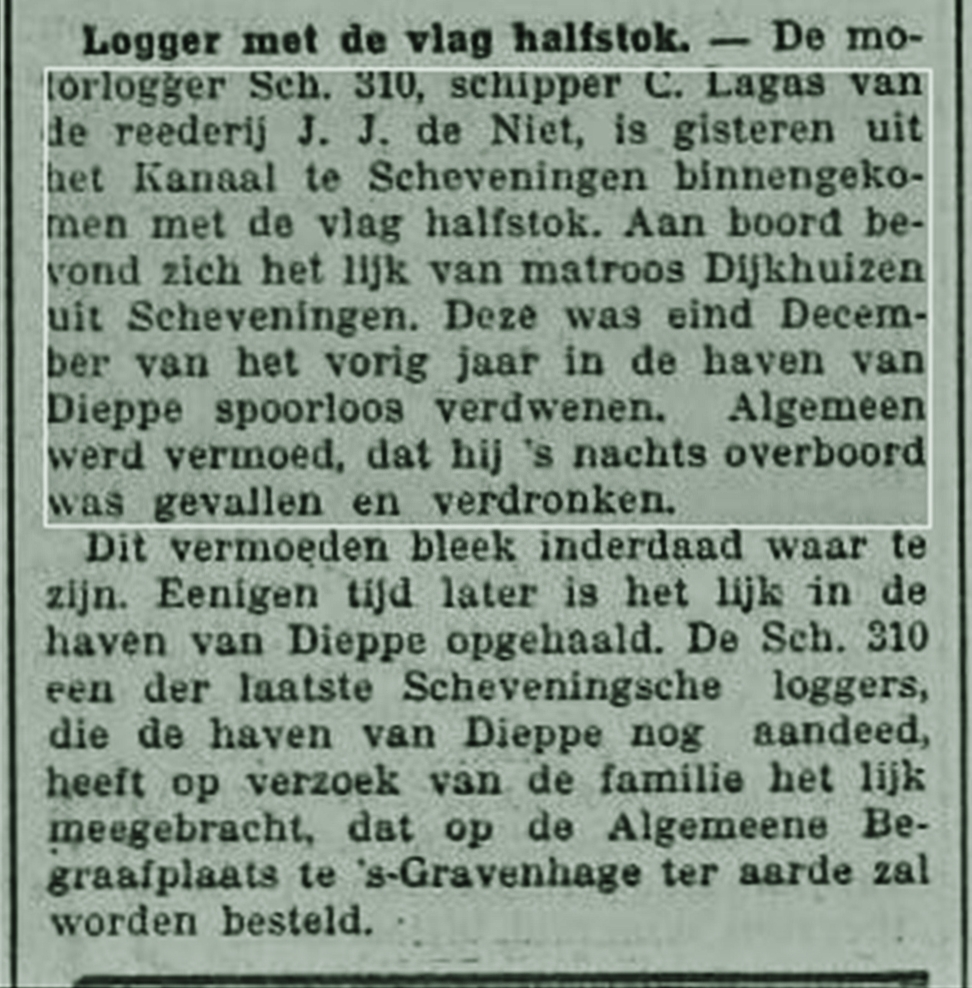 In het Franse Dieppe werd Arie Dijkhuizen vermist. Pas in januari 1928 werd zijn lichaam in de haven gevonden en met de SCH 310 op de 27e januari naar Scheveningen gebracht.