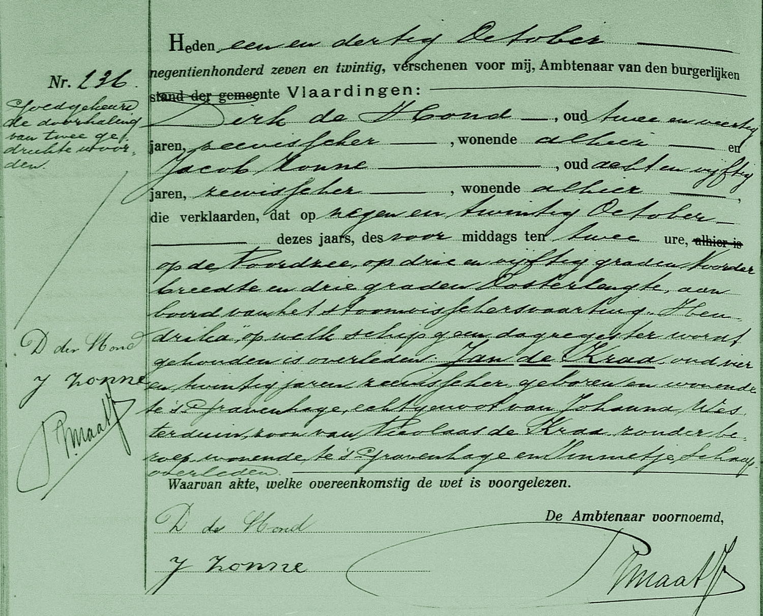 Matroos Jan de Kraa sloeg tijdens stormweer overboord en werd niet meer gevonden.