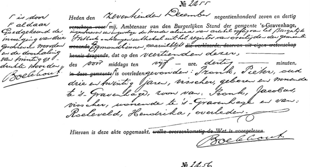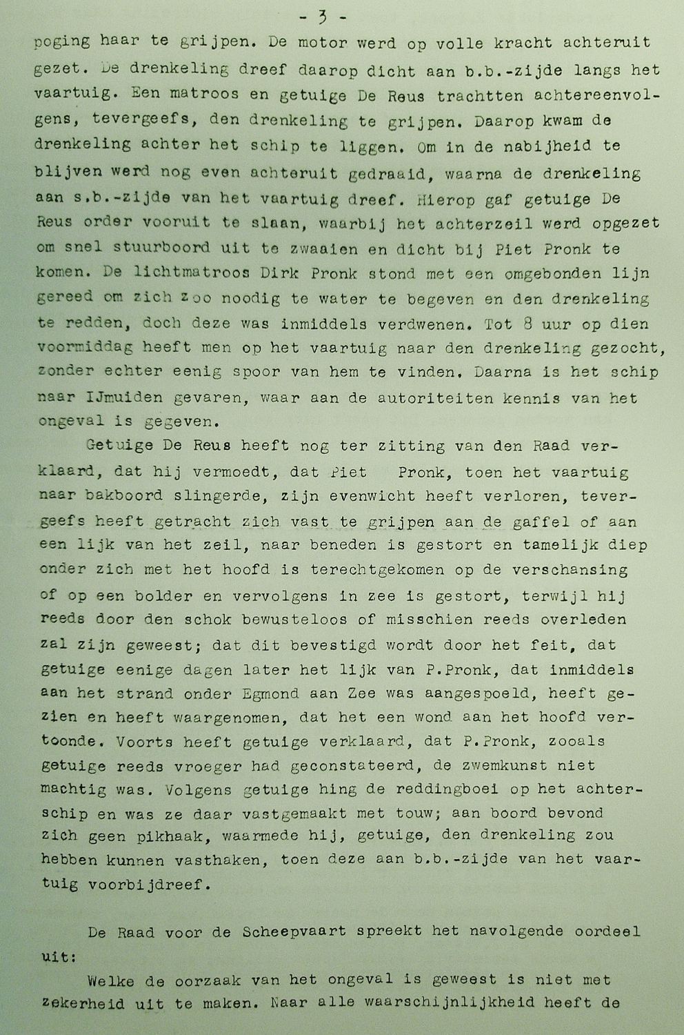 Tijdens het innemen van het gatzeil, circa twee mijlen van IJmuiden, viel matroos Pieter Pronk vanaf de sloep eerst op de verschansing en vervolgens, bewusteloos of al overleden, overboord en verdronk. Het lichaam spoelde op 14 december, twee kilometer ten noorden van Egmond a/zee, op het strand aan. Het lichaam werd naar Katwijk a/zee vervoerd alwaar hij werd begraven.