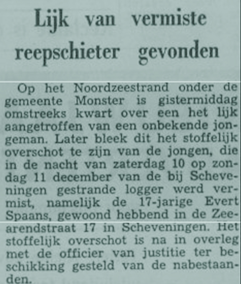 De logger liep op het zuiderhavenhoofd van Scheveningen waarbij door overkomend water Evert Jacobus Ment Spaans overboord sloeg en verdronk.